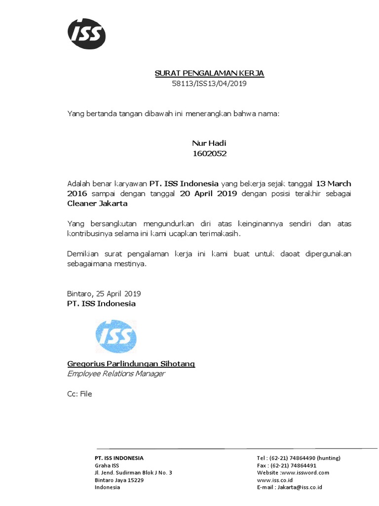 Paklaring pt iss indonesia Surat Pengalaman Kerja Docx